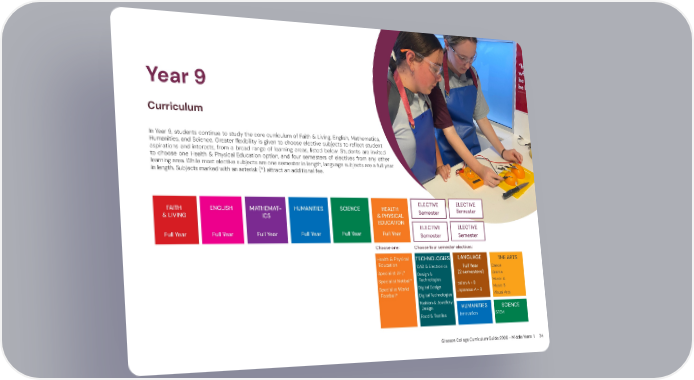 Gleeson College Curriculum Guide 2026 - Middle Years | 24 Year 9 Curriculum In Year 9, students continue to study the core curriculum of Faith & Living, English, Mathematics, Humanities, and Science. Greater flexibility is given to choose elective subjects to reflect student aspirations and interests, from a broad range of learning areas, listed below. Students are invited to choose one Health & Physical Education option, and four semesters of electives from any other learning area. While most elective subjects are one semester in length, language subjects are a full year in length. Subjects marked with an asterisk (*) attract an additional fee. Choose one: Choose four semester electives: Health & Physical Education Specialist AFL* Specialist Netball* Specialist World Football* HEALTH & PHYSICAL EDUCATION Full Year FAITH & LIVING Full Year ENGLISH Full Year MATHEMAT- ICS Full Year SCIENCE Full Year LANGUAGE Full Year (2 semesters) Italian A + B Japanese A + B THE ARTS Dance Drama Music A Music B Visual Arts TECHNOLOGIES CAD & Electronics Design & Technologies Digital Design Digital Technologies Fashion & Jewellery Design Food & Textiles HUMANITIES Full Year HUMANITIES Innovation ELECTIVE Semester SCIENCE STEM ELECTIVE Semester ELECTIVE Semester ELECTIVE Semester
