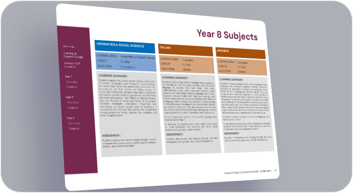 Gleeson College Curriculum Guide 2026 - Middle Years | 19 Year 8 Subjects Welcome Learning at Gleeson College Gleeson Staff Contacts Year 7 Overview Subjects Year 8 Overview Subjects Year 9 Overview Subjects HUMANITIES & SOCIAL SCIENCES LEARNING AREA: Humanities & Social Sciences LENGTH: Full Year SELECTION: Compulsory LEARNING SUMMARY: Students explore key topics across History, Civics and Citizenship, Geography, and Economics and Business. In History, they study the period from 650–1750 CE, focusing on the Black Death and Viking society. In Civics and Citizenship, students learn about Australia’s democratic system, levels of government, and how laws are made and applied. They reflect on national identity and the influence of culture and history. In Geography, students investigate urbanisation, megacities, and the impact of natural hazards such as bushfires. In Economics and Business, they explore the circular flow model, production factors, taxation, the workplace, and basic budgeting skills. ASSESSMENT: Students demonstrate their learning through a variety of assessment types, using a diverse range of research, analysis, and presentation skills. ITALIAN LEARNING SUMMARY: Students build on their skills in reading, writing, speaking, and listening in Italian by using modelled and rehearsed language to express their own ideas. They work collaboratively to plan, reflect, and solve problems, while exploring the relationship between language and culture. Students compare Italian with their own language and culture, identifying how values and traditions are reflected in language. They continue developing their understanding of Italian grammar, including articles, noun patterns, gender, and sentence structure. They also practise pronunciation and learn to use both formal and informal language. Cultural topics include family, food, friendships, and celebrations. In Year 8, students continue to study the language they have studied in Year 7. In Semester 2, students study either Italian (Continuers) or Italian (Essential). Only students who study Italian (Continuers) may study Italian in Year 9. ASSESSMENT: Students demonstrate their learning through oral tasks, reading and writing tasks, and cultural investigations. LEARNING AREA: Languages LENGTH: Full Year SELECTION: Elective JAPANESE LEARNING AREA: Languages LENGTH: Full Year SELECTION: Elective LEARNING SUMMARY: Students continue developing their skills in reading, writing, speaking, and listening in Japanese through interactive activities. By Semester 2, students are expected to be mostly fluent in reading and writing hiragana. They use modelled and rehearsed language to communicate in familiar situations and begin expressing personal ideas using learnt vocabulary and phrases. Students build their understanding of Japanese grammar, including word order, particles, adjectives, verb tenses, and levels of politeness. They create simple spoken and written texts and explore cultural topics such as towns, travel, daily routines, and the differences between Japanese and Australian culture. In Year 8, students continue to study the language they have studied in Year 7. In Semester 2, students study either Japanese (Continuers) or Japanese (Essential). Only students who study Japanese (Continuers) may study Japanese in Year 9. ASSESSMENT: Students demonstrate their learning through oral tasks, reading and writing tasks, and cultural investigations.