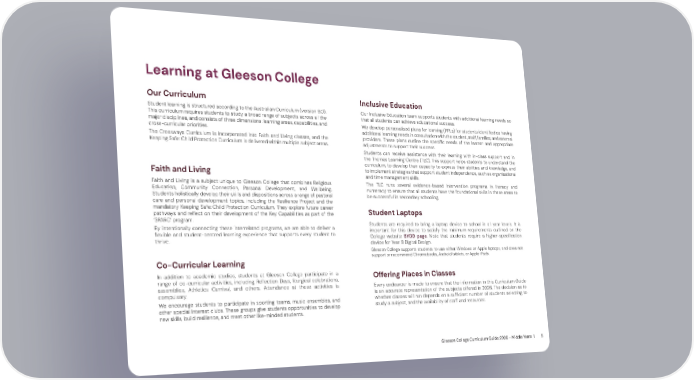 Gleeson College Curriculum Guide 2026 - Middle Years | 5 Learning at Gleeson College Our Curriculum Student learning is structured according to the Australian Curriculum (version 9.0). This curriculum requires students to study a broad range of subjects across all the major disciplines, and consists of three dimensions: learning areas, capabilities, and cross-curricular priorities. The Crossways Curriculum is incorporated into Faith and Living classes, and the Keeping Safe: Child Protection Curriculum is delivered within multiple subject areas. Faith and Living Faith and Living is a subject unique to Gleeson College that combines Religious Education, Community Connection, Personal Development, and Wellbeing. Students holistically develop their skills and dispositions across a range of pastoral care and personal development topics, including the Resilience Project and the mandatory Keeping Safe: Child Protection Curriculum. They explore future career pathways and reflect on their development of the Key Capabilities as part of the ‘SPARC’ program. By intentionally connecting these interrelated programs, we are able to deliver a flexible and student-centred learning experience that supports every student to thrive. Co-Curricular Learning In addition to academic studies, students at Gleeson College participate in a range of co-curricular activities, including Reflection Days, liturgical celebrations, assemblies, Athletics Carnival, and others. Attendance at these activities is compulsory. We encourage students to participate in sporting teams, music ensembles, and other special interest clubs. These groups give students opportunities to develop new skills, build resilience, and meet other like-minded students. Inclusive Education Our Inclusive Education team supports students with additional learning needs so that all students can achieve educational success. We develop personalised plans for learning (PPLs) for students identified as having additional learning needs in consultation with the student, staff, families, and external providers. These plans outline the specific needs of the learner and appropriate adjustments to support their success. Students can receive assistance with their learning with in-class support and in the Thomas Learning Centre (TLC). This support helps students to understand the curriculum, to develop their capacity to express their abilities and knowledge, and to implement strategies that support student independence, such as organisational and time management skills. The TLC runs several evidence-based intervention programs in literacy and numeracy to ensure that all students have the foundational skills in these areas to be successful in secondary schooling. Student Laptops Students are required to bring a laptop device to school in all year levels. It is important for this device to satisfy the minimum requirements outlined on the College website BYOD page. Note that students require a higher-specification device for Year 9 Digital Design. Gleeson College supports students to use either Windows or Apple laptops, and does not support or recommend Chromebooks, Android tablets, or Apple iPads. Offering Places in Classes Every endeavour is made to ensure that the information in this Curriculum Guide is an accurate representation of the subjects offered in 2026. The decision as to whether classes will run depends on a sufficient number of students selecting to study a subject, and the availability of staff and resources.