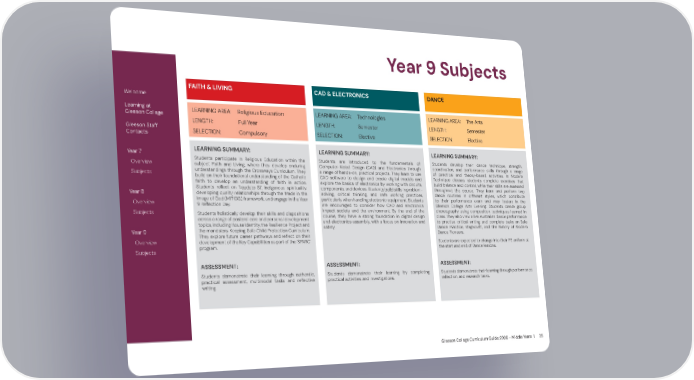 Gleeson College Curriculum Guide 2026 - Middle Years | 25 Year 9 Subjects Welcome Learning at Gleeson College Gleeson Staff Contacts Year 7 Overview Subjects Year 8 Overview Subjects Year 9 Overview Subjects LEARNING SUMMARY: Students participate in Religious Education within the subject Faith and Living, where they develop enduring understandings through the Crossways Curriculum. They build on their foundational understanding of the Catholic faith to develop an understanding of faith in action. Students reflect on ‘Laudato Si’, indigenous spirituality, developing quality relationships through the Made in the Image of God (MITIOG) framework, and engage in the Year 9 Reflection Day. Students holistically develop their skills and dispositions across a range of pastoral care and personal development topics, including House Identity, the Resilience Project and the mandatory Keeping Safe Child Protection Curriculum. They explore future career pathways and reflect on their development of the Key Capabilities as part of the ‘SPARC’ program. ASSESSMENT: Students demonstrate their learning through authentic, practical assessment, multimodal tasks and reflective writing. FAITH & LIVING LEARNING AREA: Religious Education LENGTH: Full Year SELECTION: Compulsory DANCE LEARNING AREA: The Arts LENGTH: Semester SELECTION: Elective LEARNING SUMMARY: Students develop their dance technique, strength, coordination, and performance skills through a range of practical and theory-based activities. In Modern Technique classes, students complete exercises that build balance and control, while their skills are assessed throughout the course. They learn and perform two dance routines in different styles, which contribute to their performance exam and may feature in the Gleeson College Arts Evening. Students create group choreography using composition techniques learned in class. They also view a live Australian dance performance to practise critical writing and complete tasks on Safe Dance Practice, stagecraft, and the history of Modern Dance Pioneers. Students are expected to change into their PE uniform at the start and end of Dance lessons. ASSESSMENT: Students demonstrate their learning through performance, reflection, and research tasks. CAD & ELECTRONICS LEARNING AREA: Technologies LENGTH: Semester SELECTION: Elective LEARNING SUMMARY: Students are introduced to the fundamentals of Computer-Aided Design (CAD) and Electronics through a range of hands-on, practical projects. They learn to use CAD software to design and create digital models and explore the basics of electronics by working with circuits, components, and devices. Students build skills in problem- solving, critical thinking, and safe working practices, particularly when handling electronic equipment. Students are encouraged to consider how CAD and electronics impact society and the environment. By the end of the course, they have a strong foundation in digital design and electronics assembly, with a focus on innovation and safety. ASSESSMENT: Students demonstrate their learning by completing practical activities and investigations.