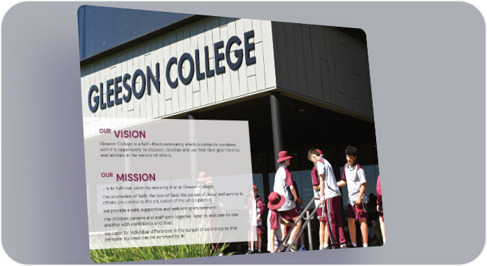 Gleeson College is a faith-filled community which provides its members with the opportunity to discover, develop and use their God-given talents and abilities in the service of others. ... is to fulfil our vision by ensuring that at Gleeson College: the promotion of faith, the love of God, the person of Jesus and service to others are central to the education of the whole person; we provide a safe, supportive and welcoming environment; the children, parents and staff work together, listen to and care for one another with confidence and trust; we cater for individual differences in the pursuit of excellence so that personal success can be achieved by all. MISSION OUR VISION OUR