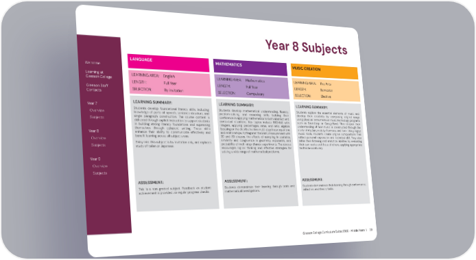 Gleeson College Curriculum Guide 2026 - Middle Years | 20 Year 8 Subjects Welcome Learning at Gleeson College Gleeson Staff Contacts Year 7 Overview Subjects Year 8 Overview Subjects Year 9 Overview Subjects LANGUAGE LEARNING AREA: English LENGTH: Full Year SELECTION: By invitation LEARNING SUMMARY: Students develop foundational literacy skills, including knowledge of parts of speech, sentence structure, and single paragraph construction. The course content is delivered through explicit instruction to support students in building strong literacy foundations and expressing themselves through coherent writing. These skills enhance their ability to communicate effectively and benefit learning across all subject areas. Entry into this subject is by invitation only, and replaces study of Italian or Japanese. ASSESSMENT: This is a non-graded subject. Feedback on student achievement is provided via regular progress checks. MATHEMATICS LEARNING SUMMARY: Students develop mathematical understanding, fluency, problem-solving, and reasoning skills, building their confidence in applying mathematics to both abstract and contextual situations. Key topics include BEDMAS with integers, applying percentages, rates, and ratio, algebra focusing on the distributive law, multi-step linear equations and relationships, Pythagoras’ theorem, measurement with 2D and 3D shapes, the effects of sampling in statistics, similarity and congruence in geometry, exponents, and probability of multi-step chance experiments. The course encourages logical thinking and effective strategies for solving a wide range of mathematical problems. ASSESSMENT: Students demonstrate their learning through tests and mathematical investigations. LEARNING AREA: Mathematics LENGTH: Full Year SELECTION: Compulsory MUSIC CREATION LEARNING AREA: The Arts LENGTH: Semester SELECTION: Elective LEARNING SUMMARY: Students explore the essential elements of music and develop their creativity by composing original songs using physical instruments or music technology programs such as Soundtrap or GarageBand. They deepen their understanding of how music is constructed through the study of rhythm, melody, harmony, and form. Using digital music tools, students create original compositions that reflect personal expression and technical skill. They also refine their listening and analytical abilities by evaluating their own works and those of others, applying appropriate technical vocabulary. ASSESSMENT: Students demonstrate their learning through performance, reflection, and theory tasks.