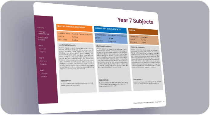 Gleeson College Curriculum Guide 2026 - Middle Years | 10 Year 7 Subjects Welcome Learning at Gleeson College Gleeson Staff Contacts Year 7 Overview Subjects Year 8 Overview Subjects Year 9 Overview Subjects LEARNING SUMMARY: Students engage in a variety of physical activities including athletics, adventure challenges, and an introduction to outdoor education. These experiences help develop knowledge and skills in health, safety, wellbeing, and movement. Students refine specialised movement skills across a range of game types, including target, invasion, net/wall, and striking/fielding games. They examine how body control and coordination affect performance and apply movement concepts across different settings. A highlight of the course is the Sports Education unit, where students take on different roles to collaboratively organise and participate in a structured sports competition, building leadership, communication, and teamwork. ASSESSMENT: Students demonstrate their learning through practical assessments and theory tasks. HEALTH & PHYSICAL EDUCATION HUMANITIES & SOCIAL SCIENCES LEARNING AREA: Humanities & Social Sciences LENGTH: Full Year SELECTION: Compulsory LEARNING SUMMARY: Students explore key ideas across Geography, History, Economics and Business, and Civics and Citizenship. In Geography, they build research skills by investigating the importance of water: how we use it, why it matters, and the problems it can cause. In Economics and Business, students learn how markets work, create a product pitch, and explore fair trade and sustainability. In History, they study early human migration and First Nations histories and cultures, as well as one ancient civilisation such as Greece, Rome, Egypt, India, or China. In Civics and Citizenship, students learn about democracy, laws, and how migration has shaped modern Australia. ASSESSMENT: Students demonstrate their learning through a variety of assessment types, using a diverse range of research, analysis, and presentation skills. ITALIAN LEARNING AREA: Health & Physical Education LENGTH: Full Year SELECTION: Elective LEARNING SUMMARY: Students develop their skills in reading, writing, speaking, and listening in Italian by using modelled and rehearsed language in familiar situations, and begin to create and communicate their own ideas. They work collaboratively to plan, problem-solve, and reflect on their learning. Students explore the connections between language and culture by comparing Italian with their own language and experiences. They study topics such as school, food, and self, while learning pronunciation, sentence structure, and grammar including articles, gender, and agreement. Through this, they build confidence in using Italian and reflect on what it means to move between languages and cultures. ASSESSMENT: Students demonstrate their learning through oral tasks, reading and writing tasks, and cultural investigations. LEARNING AREA: Languages LENGTH: Full Year SELECTION: Elective