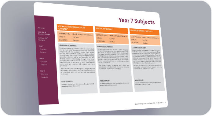 Gleeson College Curriculum Guide 2026 - Middle Years | 13 Year 7 Subjects Welcome Learning at Gleeson College Gleeson Staff Contacts Year 7 Overview Subjects Year 8 Overview Subjects Year 9 Overview Subjects LEARNING SUMMARY: Students with a strong interest in Australian Rules Football develop their skills through practical and theoretical components of this specialist course. They receive coaching from accredited coaches and guest speakers, focusing on key skills such as kicking, marking, handballing, groundball collection, tackling, and movement. They also develop tactical understanding through game sense strategies and match-day setups. The course emphasises safe techniques to reduce risk of injury. Theory lessons cover food and nutrition, skills analysis, and injury prevention. The Australian Rules Football Program is designed for male and female students who currently play football, preferably at a club level. Entry may involve a trial, and additional costs apply. ASSESSMENT: Students demonstrate their learning through practical assessments and theory tasks. SPECIALIST NETBALL* LEARNING AREA: Health & Physical Education LENGTH: Full Year SELECTION: Elective LEARNING SUMMARY: Students build confidence and skill in netball through a comprehensive program that combines practical training and theory to support holistic athlete development. The course focuses on key areas such as footwork, ball handling, attacking, defending, shooting, strategy, fitness, and team dynamics. Practical lessons are enriched by specialist coaching from elite-level players and coaches. Theory lessons include food and nutrition, game ethics, and injury prevention. The Netball Program is designed for students who currently play netball, preferably at club level. Entry may involve a trial, and additional costs apply. ASSESSMENT: Students demonstrate their learning through practical assessments and theory tasks. SPECIALIST WORLD FOOTBALL* LEARNING SUMMARY: Students build key individual skills such as ball striking, first touch, close control, and 1v1 techniques. They develop an understanding of the ‘Gleeson Way’ of playing, focusing on team roles within a 4-3-3 formation and effective ball movement through defence, midfield, and attack. Learning additionally incorporates futsal, tactical concepts like pressing, transitions, and counterattacking, and the use of ICT tools to analyse performance. Physical fitness and wellbeing are key areas of focus throughout. The World Football Program is designed for students who currently play football, preferably at club level. Entry may involve a trial, and additional costs apply. ASSESSMENT: Students demonstrate their learning through practical assessments and theory tasks. LEARNING AREA: Health & Physical Education LENGTH: Full Year SELECTION: Elective SPECIALIST AUSTRALIAN RULES FOOTBALL* LEARNING AREA: Health & Physical Education LENGTH: Full Year SELECTION: Elective