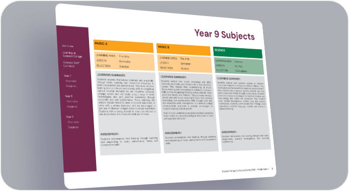 Gleeson College Curriculum Guide 2026 - Middle Years | 31 Year 9 Subjects MUSIC A LEARNING AREA: The Arts LENGTH: Semester SELECTION: Elective LEARNING SUMMARY: Students express themselves creatively and practically through music, applying their theoretical knowledge in both composition and performance. They build on prior learning in music theory and develop skills in recognising various musical elements by ear. Students compose, arrange, record, and edit music using a range of music technologies, and gain practical experience through ensemble and solo performance. Those selecting this subject should intend to learn a musical instrument or voice with a private instructor, and are encouraged to join one of Gleeson College’s extra-curricular ensembles. Students with a strong interest in music are advised to also study Music B to complete a full year of music. ASSESSMENT: Students demonstrate their learning through exploring and responding to music, performance, theory and composition tasks. Welcome Learning at Gleeson College Gleeson Staff Contacts Year 7 Overview Subjects Year 8 Overview Subjects Year 9 Overview Subjects MUSIC B LEARNING AREA: The Arts LENGTH: Semester SELECTION: Elective LEARNING SUMMARY: Students extend their music knowledge and skills creatively, practically, and theoretically in this advanced course. They deepen their understanding of music theory, learning new compositional techniques and aural skills such as recognising rhythms, scales, intervals, major and minor chords, and melodies. They compose, arrange, record, and edit music using digital tools, and continue developing their performance skills through both solo and ensemble work. Participation in a Gleeson College extracurricular ensemble is strongly encouraged to support ongoing musical growth. Music B is only available to students who have completed Music A and are currently learning an instrument or voice with a private instructor. ASSESSMENT: Students demonstrate their learning through exploring and responding to music, performance, and composition tasks. SCIENCE LEARNING SUMMARY: Students explore how systems operate at different scales and respond to change to maintain balance. They investigate how the human body reacts to the environment, how reproduction supports species survival, and how atoms bond and change through nuclear decay. Students learn how matter is rearranged in chemical changes and how energy and matter are conserved. They conduct safe, reliable investigations, analyse data, and evaluate conclusions. Students communicate their findings using appropriate scientific language, models, and evidence- based reasoning. ASSESSMENT: Students demonstrate their learning through topic tests, assignments, research investigations, and practical experiments. LEARNING AREA: Science LENGTH: Full Year SELECTION: Compulsory