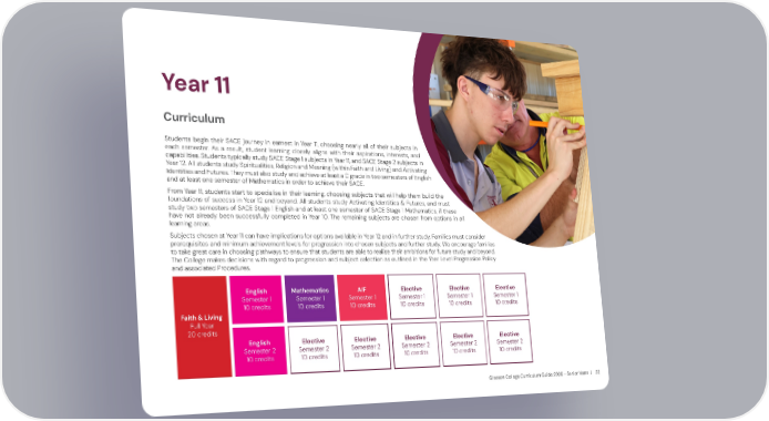 Gleeson College Curriculum Guide 2026 - Senior Years | 32 Year 11 Curriculum Students begin their SACE journey in earnest in Year 11, choosing nearly all of their subjects in each semester. As a result, student learning closely aligns with their aspirations, interests, and capabilities. Students typically study SACE Stage 1 subjects in Year 11, and SACE Stage 2 subjects in Year 12. All students study Spiritualities, Religion and Meaning (within Faith and Living) and Activating Identities and Futures. They must also study and achieve at least a C grade in two semesters of English and at least one semester of Mathematics in order to achieve their SACE. From Year 11, students start to specialise in their learning, choosing subjects that will help them build the foundations of success in Year 12 and beyond. All students study Activating Identities & Futures, and must study two semesters of SACE Stage 1 English and at least one semester of SACE Stage 1 Mathematics, if these have not already been successfully completed in Year 10. The remaining subjects are chosen from options in all learning areas. Subjects chosen at Year 11 can have implications for options available in Year 12 and in further study. Families must consider prerequisites and minimum achievement levels for progression into chosen subjects and further study. We encourage families to take great care in choosing pathways to ensure that students are able to realise their ambitions for future study and beyond. The College makes decisions with regard to progression and subject selection as outlined in the Year Level Progression Policy and associated Procedures. AIF Semester 1 10 credits Faith & Living Full Year 20 credits Mathematics Semester 1 10 credits Elective Semester 1 10 credits English Semester 2 10 credits English Semester 1 10 credits Elective Semester 1 10 credits Elective Semester 1 10 credits Elective Semester 2 10 credits Elective Semester 2 10 credits Elective Semester 2 10 credits Elective Semester 2 10 credits Elective Semester 2 10 credits