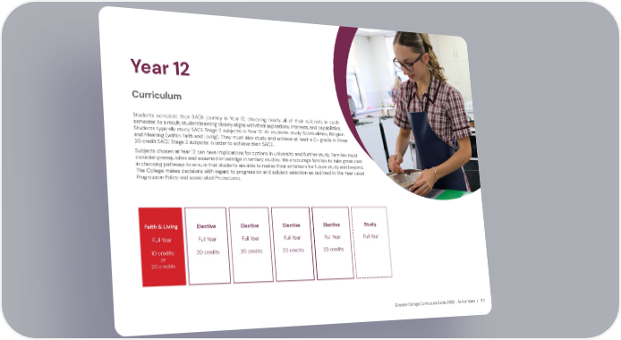 Gleeson College Curriculum Guide 2026 - Senior Years | 50 Year 12 Curriculum Students complete their SACE journey in Year 12, choosing nearly all of their subjects in each semester. As a result, student learning closely aligns with their aspirations, interests, and capabilities. Students typically study SACE Stage 2 subjects in Year 12. All students study Spiritualities, Religion and Meaning (within Faith and Living). They must also study and achieve at least a C- grade in three 20 credit SACE Stage 2 subjects in order to achieve their SACE. Subjects chosen at Year 12 can have implications for options in university and further study. Families must consider prerequisites and assumed knowledge in tertiary studies. We encourage families to take great care in choosing pathways to ensure that students are able to realise their ambitions for future study and beyond. The College makes decisions with regard to progression and subject selection as outlined in the Year Level Progression Policy and associated Procedures. Semester Elective Full Year 20 credits Faith & Living Full Year 10 credits or 20 credits Elective Full Year 20 credits Elective Full Year 20 credits Elective Full Year 20 credits Study Full Year
