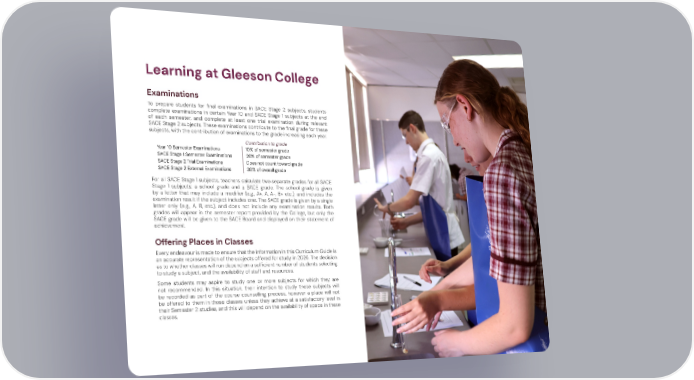 Gleeson College Curriculum Guide 2026 - Senior Years | 7 Learning at Gleeson College Examinations To prepare students for final examinations in SACE Stage 2 subjects, students complete examinations in certain Year 10 and SACE Stage 1 subjects at the end of each semester, and complete at least one trial examination during relevant SACE Stage 2 subjects. These examinations contribute to the final grade for these subjects, with the contribution of examinations to the grade increasing each year. Offering Places in Classes Every endeavour is made to ensure that the information in this Curriculum Guide is an accurate representation of the subjects offered for study in 2026. The decision as to whether classes will run depend on a sufficient number of students selecting to study a subject, and the availability of staff and resources. Some students may aspire to study one or more subjects for which they are not recommended. In this situation, their intention to study these subjects will be recorded as part of the course counselling process, however a place will not be offered to them in those classes unless they achieve at a satisfactory level in their Semester 2 studies, and this will depend on the availability of space in these classes. For all SACE Stage 1 subjects, teachers calculate two separate grades for all SACE Stage 1 subjects: a school grade and a SACE grade. The school grade is given by a letter that may include a modifier (e.g., A+, A, A-, B+ etc.), and includes the examination result if the subject includes one. The SACE grade is given by a single letter only (e.g., A, B, etc.), and does not include any examination results. Both grades will appear in the semester report provided by the College, but only the SACE grade will be given to the SACE Board and displayed on their statement of achievement. Contribution to grade Year 10 Semester Examinations 10% of semester grade SACE Stage 1 Semester Examinations 20% of semester grade SACE Stage 2 Trial Examinations Does not count toward grade SACE Stage 2 External Examinations 30% of overall grade
