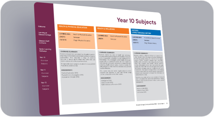 Gleeson College Curriculum Guide 2026 - Senior Years | 23 Year 10 Subjects HEALTH & PHYSICAL EDUCATION LEARNING AREA: Health & Physical Education LENGTH: Semester LEADS TO: Stage 1 Physical Education LEARNING SUMMARY: Students deepen their understanding of applied exercise physiology, biomechanics and energy systems to improve performance. They undertake a range of practical activities in various sports where they collect and use data to analyse and evaluate performances. This specialist course prepares students for study in SACE Physical Education courses. ASSESSMENT: Practical Application (30%) Physical Activity Investigation (40%) Improvement Analysis (30%) Welcome Learning at Gleeson College Gleeson Staff Contacts Senior Learning Pathways Year 10 Overview Subjects Year 11 Overview Subjects Year 12 Overview Subjects HEALTH & WELLBEING LEARNING AREA: Health & Physical Education LENGTH: Semester LEARNING SUMMARY: Students explore key areas of health and wellbeing, including mental health strategies, the benefits of physical activity, responsible technology use, and building positive relationships. They investigate current health issues and analyse data to understand trends and their impact on individual and community wellbeing. By researching and evaluating health-related topics, students develop the skills needed to make informed decisions and promote healthier lifestyles. This course does not involve regular physical activity. Students are expected to wear their formal college uniform, unless directed by their teacher. ASSESSMENT: Investigation (30%) Issues Analysis (30%) Health Advocacy & Promotion (40%) LEARNING SUMMARY: Students explore a historical bottom-up approach in Living Through History, focusing on the lived experiences of everyday people during key moments in Australia’s modern history. Students examine how individuals, families, and communities were shaped by the Second World War, migration, and protest. Through personal stories, photographs, letters, and oral stories, they gain insight into what it felt like to live through events such as the Kokoda campaign, post-war immigration, and social movements. This approach brings history to life, helping students understand how ordinary people contributed to, endured, and responded to changes that still shape our national identity today. Students must select at least one semester of History in Year 10. Students may select both semesters of History; however, there is some crossover in basic content and skill development. ASSESSMENT: Historical Skills (60%) Historical Study (30%) Examination (10%) HISTORY: LIVING THROUGH HISTORY LEARNING AREA: Humanities & Social Sciences LENGTH: Semester LEADS TO: Stage 1 Modern History