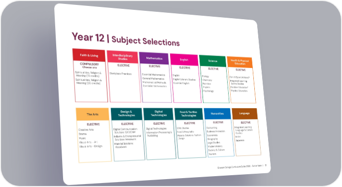 Gleeson College Curriculum Guide 2026 - Senior Years | 51 Choose one Year 12 | Subject Selections Biology Chemistry Nutrition Physics Psychology Workplace Practices Cert III Sport (Athlete)* Integrated Learning: Sports Studies Outdoor Education* Physical Education ELECTIVE The Arts Creative Arts Drama Music Visual Arts - Art Visual Arts - Design ELECTIVE Accounting Business Innovation Economics Geography Legal Studies Modern History Society & Culture Tourism Humanities Health & PE Semester COMPULSORY ELECTIVE ELECTIVE ELECTIVE ELECTIVE Design & Technologies Digital Communication Solutions: CAD/CAM Industry & Entreprenuerial Solutions: Metalwork Material Solutions: Woodwork ELECTIVE Child Studies Food & Hospitality Material Solutions: Fashion Design Food & Textiles Technologies Language ELECTIVE Integrated Learning: Language & Culture Studies Italian Japanese ELECTIVE ELECTIVE ELECTIVE Digital Technologies Digital Technologies Information Processing & Publishing Faith & Living Mathematics Spiritualities, Religion & Meaning (10 credits) Spiritualities, Religion & Meaning (20 credits) English English English Literary Studies Essential English Essential Mathematics General Mathematics Mathematical Methods Specialist Mathematics Science Interdisciplinary Studies Health & Physical Education