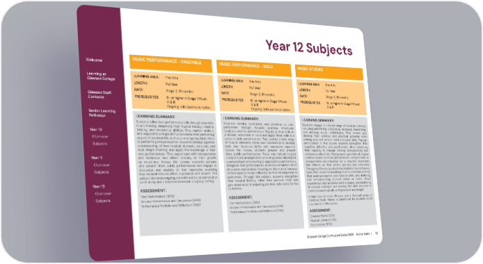 Gleeson College Curriculum Guide 2026 - Senior Years | 62 Year 12 Subjects Welcome Learning at Gleeson College Gleeson Staff Contacts Senior Learning Pathways Year 10 Overview Subjects Year 11 Overview Subjects Year 12 Overview Subjects LEARNING SUMMARY: Students refine their performance skills through ensemble music-making, deepening their musical literacy, creative thinking, and interpretive abilities. They explore, analyse, and respond to a range of musical works while performing as part of an ensemble such as a small group, band, choir, or performing arts production. Students develop a greater understanding of how musical elements, structure, and style shape meaning, and apply this knowledge in their own performances. They experiment with interpretation and technique, and reflect critically on their growth as musicians. Across the course, students prepare and present three public performances and engage in discussion and analysis of their repertoire, exploring how musical choices affect expression and impact. This subject demands ongoing commitment to instrumental or vocal study and consistent rehearsal in a group setting. ASSESSMENT: First Performance (30%) Second Performance and Discussion (40%) Performance Portfolio and Reflection (30%) MUSIC PERFORMANCE - ENSEMBLE LEARNING AREA: The Arts LENGTH: Full Year SACE: Stage 2, 20 credits PREREQUISITES: B- or higher in Stage 1 Music A & B Ongoing individual music tuition MUSIC PERFORMANCE - SOLO LEARNING AREA: The Arts LENGTH: Full Year SACE: Stage 2, 20 credits PREREQUISITES: B- or higher in Stage 1 Music A & B Ongoing individual music tuition LEARNING SUMMARY: Students develop confidence and precision as solo performers through focused practice, structured feedback, and live performance. They build their skills on a chosen instrument or voice and apply these skills in a series of solo performances. They explore a wide range of musical elements, styles, and conventions to develop both their technical ability and expressive capacity. Across the course, students prepare and present three public performances. These may include original compositions, arrangements, or existing works, allowing for a personalised and meaningful approach to performance. Alongside their performances, students complete a short discussion and analysis, focusing on the musical features of their repertoire and reflecting on their development as performers. Through this subject, students strengthen their musical literacy, refine their personal style, and gain experience in preparing polished solo works for live audiences. ASSESSMENT: First Performance (30%) Second Performance and Discussion (40%) Performance Portfolio and Reflection (30%) MUSIC STUDIES LEARNING AREA: The Arts LENGTH: Full Year SACE: Stage 2, 20 credits PREREQUISITES: B- or higher in Stage 1 Music A & B LEARNING SUMMARY: Students engage in a broad range of musical activities, including performing, composing, arranging, researching, and applying music technologies. They explore and develop their creative and practical potential while refining oral and written communication skills. Through participation in this course, students strengthen their cognitive, affective, and psychomotor skills, enhancing their capacity to manage learning independently and collaborate effectively. They present a portfolio of original creative works—such as performances, compositions, or arrangements—accompanied by a creator’s statement that reflects on their artistic process and outcomes. Throughout the course, students complete musical literacy tasks that involve manipulating musical elements, refining their aural perception and notation skills, and analysing and deconstructing musical works or styles. These experiences help students build a deeper understanding of musical concepts and develop the skills required to communicate musically with precision and insight. A high level of music literacy and a thorough grasp of complex music theory is paramount for students to be successful in this course. ASSESSMENT: Creative Works (30%) Musical Literacy (40%) Examination (30%)