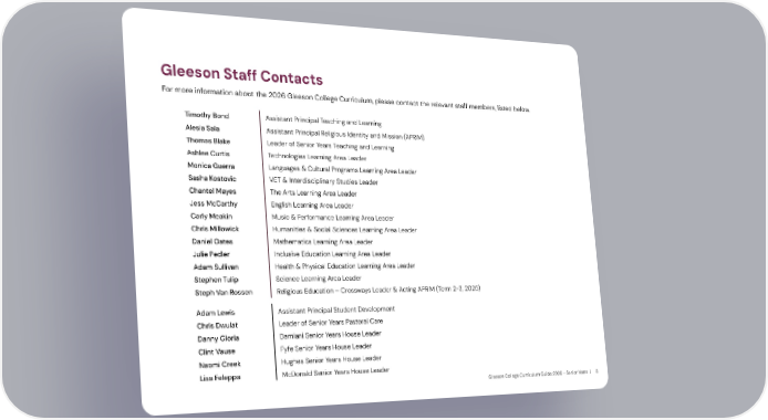Gleeson College Curriculum Guide 2026 - Senior Years | 8 For more information about the 2026 Gleeson College Curriculum, please contact the relevant staff members, listed below. Gleeson Staff Contacts Timothy Bond Assistant Principal Teaching and Learning Alesia Sala Assistant Principal Religious Identity and Mission (APRIM) Thomas Blake Leader of Senior Years Teaching and Learning Ashlee Curtis Technologies Learning Area Leader Monica Guerra Languages & Cultural Programs Learning Area Leader Sasha Kostovic VET & Interdisciplinary Studies Leader Chantel Mayes The Arts Learning Area Leader Jess McCarthy English Learning Area Leader Carly Meakin Music & Performance Learning Area Leader Chris Millowick Humanities & Social Sciences Learning Area Leader Daniel Oates Mathematics Learning Area Leader Julie Pedler Inclusive Education Learning Area Leader Adam Sullivan Health & Physical Education Learning Area Leader Stephen Tulip Science Learning Area Leader Steph Van Rossen Religious Education – Crossways Leader & Acting APRIM (Term 2-3, 2025) Adam Lewis Assistant Principal Student Development Chris Dwulat Leader of Senior Years Pastoral Care Danny Gloria Damiani Senior Years House Leader Clint Vause Fyfe Senior Years House Leader Naomi Creek Hughes Senior Years House Leader Lisa Feleppa McDonald Senior Years House Leader