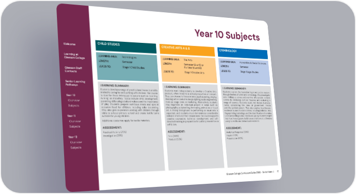 Gleeson College Curriculum Guide 2026 - Senior Years | 17 Year 10 Subjects Welcome Learning at Gleeson College Gleeson Staff Contacts Senior Learning Pathways Year 10 Overview Subjects Year 11 Overview Subjects Year 12 Overview Subjects LEARNING SUMMARY: Students develop a range of practical and theoretical skills related to caring for and working with children. This course is ideal for those interested in careers such as teaching, nursing, or midwifery. Topics include child development, parenting skills using a baby simulator, and the importance of play. Students prepare nutritious meals and special occasion food for children, including cake decorating. They also gain experience working with children through visits to a local primary school and create textile items suitable for young children. Additional costs may apply for textile materials. ASSESSMENT: Practical Activity (75%) Investigation (25%) CHILD STUDIES LEARNING AREA: Technologies LENGTH: Semester LEADS TO: Stage 1 Child Studies CREATIVE ARTS A & B LEARNING AREA: The Arts LENGTH: Semester (A or B) or Full Year (A and B) LEADS TO: Stage 1 Creative Arts LEARNING SUMMARY: Students work independently to develop a Creative Arts product, often linked to a school production or concert. They can choose to focus on areas such as acting, singing, dancing, set or costume design, lighting, audio engineering, makeup, stage crew, or marketing. Alternatively, students may negotiate an individual project in areas such as photography, scriptwriting, filmmaking, animation, or visual art. A strong background in performing or visual arts is expected, and students must demonstrate considerable skill and initiative in their chosen area. The course supports creative expression, technical development, and self- directed learning in preparation for public presentation or exhibition. ASSESSMENT: Folio (50%) Product (50%) LEARNING SUMMARY: Students explore the Australian legal and justice system through the lens of crime and criminology. They investigate what defines a crime and examine why people commit crimes by analysing criminal theories and evaluating a range of sources. Students study well-known Australian cases, considering the roles of government, media, and the judicial system. They also explore how forensic evidence is used to solve crimes, including ballistics, DNA, fingerprinting, toxicology, and the identification of remains. Criminal profiling is also introduced, giving students insight into how investigators build cases and convict offenders using scientific and behavioural evidence. ASSESSMENT: Analytical Response (30%) Inquiry (40%) Presentation (30%) CRIMINOLOGY LEARNING AREA: Humanities & Social Sciences LENGTH: Semester LEADS TO: Stage 1 Legal Studies
