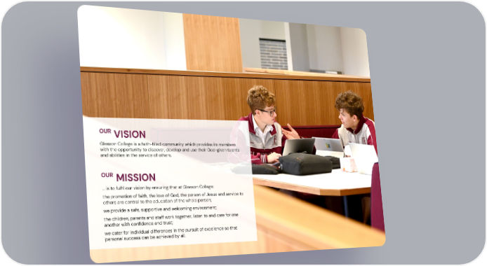 Gleeson College is a faith-filled community which provides its members with the opportunity to discover, develop and use their God-given talents and abilities in the service of others. ... is to fulfil our vision by ensuring that at Gleeson College: the promotion of faith, the love of God, the person of Jesus and service to others are central to the education of the whole person; we provide a safe, supportive and welcoming environment; the children, parents and staff work together, listen to and care for one another with confidence and trust; we cater for individual differences in the pursuit of excellence so that personal success can be achieved by all. MISSION OUR VISION OUR