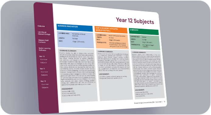 Gleeson College Curriculum Guide 2026 - Senior Years | 53 Year 12 Subjects Welcome Learning at Gleeson College Gleeson Staff Contacts Senior Learning Pathways Year 10 Overview Subjects Year 11 Overview Subjects Year 12 Overview Subjects LEARNING SUMMARY: Students develop the skills to design, refine, and pitch innovative business ideas that solve real-world problems. Working both independently and in teams, they apply the Design Thinking process to explore challenges, test solutions, and respond to feedback. This course encourages students to take risks, learn from failure, and experiment with digital technologies as they bring their ideas to life. Teachers act as mentors, guiding students as they analyse decisions, test assumptions, and lead their own learning journey. Students explore at least two key business contexts: designing, sustaining, and transforming business. Through these contexts, they build knowledge in innovation, project management, financial literacy, and global and digital trends. They also gain an understanding of core business concepts such as business structures, legal responsibilities, and sources of finance. This course suits students who enjoy creative thinking, problem- solving, and collaboration, and who are motivated to explore how business can make a positive impact. ASSESSMENT: Business Skills (40%) Business Model (30%) Business Plan and Pitch (30%) BUSINESS INNOVATION LEARNING AREA: Humanities & Social Sciences LENGTH: Full Year SACE: Stage 2, 20 credits CERT III IN SPORT (ATHLETE): WORLD FOOTBALL LEARNING AREA: Health & Physical Education LENGTH: Full Year SACE: Stage 2, 20 credits PREREQUISITES: Previous participation in World Football subject, Club Football, willingness to play for the College. LEARNING SUMMARY: Offered every two years, the dual qualification Certificate II in Community Services and Certificate III in Sport (Athlete): World Football Program provides students with the opportunity to develop their sporting industry knowledge and skills, giving them a taste of life as a professional athlete whilst also developing practical skills in soccer with the specialist trainer. This course will cover a range of core and elective competencies, and see successful participants complete the program with dual VET qualifications. An additional cost of approximately $700 (TBC) will be charged for participation. ASSESSMENT: Competency bases vocational training via Learning Management System and specialist trainer. CHEMISTRY LEARNING AREA: Science LENGTH: Full Year SACE: Stage 2, 20 credits PREREQUISITES: B- or higher in Stage 1 Chemistry LEARNING SUMMARY: Students deepen their understanding of how the physical world is chemically constructed and explore the interaction between human activity and the environment. They examine how scientific knowledge evolves through new evidence and technologies, and consider the social and environmental impacts of chemical processes. They study the monitoring of environmental change, learning how chemists analyse pollutants and the effects of fossil fuel use through techniques such as chromatography, spectroscopy, and titration. Students explore chemical production, reaction rates, energy use, and how conditions can be optimised using equilibrium principles. In organic and biological chemistry, they investigate the structure, reactions, and significance of organic compounds including carbohydrates, triglycerides, and proteins. The course also addresses human use of natural resources, renewable and non-renewable energy sources, and the environmental impact of material consumption and recycling. Students use practical experiments to observe phenomena, improve their understanding of theories, and develop independent safe laboratory practices. ASSESSMENT: Investigations Folio (30%) Skills and Applications Tasks (40%) Examination (30%)