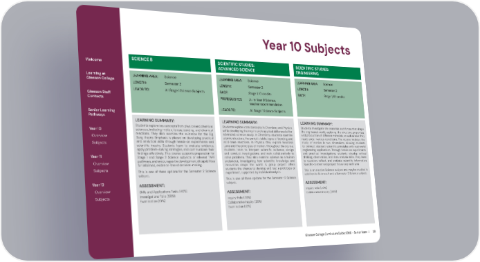 Gleeson College Curriculum Guide 2026 - Senior Years | 30 Year 10 Subjects LEARNING SUMMARY: Students explore key concepts from physical and chemical sciences, including motion, forces, bonding, and chemical reactions. They also examine the evidence for the Big Bang theory. Emphasis is placed on developing practical and analytical skills through hands-on experiments and scientific inquiry. Students learn to evaluate evidence, apply problem-solving strategies, and communicate their findings effectively. This course supports preparation for Stage 1 and Stage 2 Science subjects or relevant TAFE pathways, and encourages the development of capabilities for informed, evidence-based decision-making. This is one of three options for the Semester 2 Science subject. ASSESSMENT: SCIENCE B LEARNING AREA: Science LENGTH: Semester 2 LEADS TO: All Stage 1 Science Subjects Skills and Applications Tasks (40%) Investigations Folio (50%) Examination (10%) Welcome Learning at Gleeson College Gleeson Staff Contacts Senior Learning Pathways Year 10 Overview Subjects Year 11 Overview Subjects Year 12 Overview Subjects SCIENTIFIC STUDIES: ADVANCED SCIENCE LEARNING AREA: Science LENGTH: Semester 2 SACE: Stage 1, 10 credits PREREQUISITES: A– in Year 9 Science, teacher recommendation LEADS TO: All Stage 1 Science Subjects LEARNING SUMMARY: Students explore core concepts in Chemistry and Physics while developing the inquiry and analytical skills needed for advanced science study. In Chemistry, students examine atomic structure, the periodic table, types of bonding, and acid-base reactions. In Physics, they explore Newton’s Laws and the principles of motion. Throughout the course, students learn to interpret scientific evidence, design and conduct investigations, and work collaboratively to solve problems. They also examine science as a human endeavour, investigating how scientific knowledge and innovation shape the world. A group project offers students the chance to develop and test a prototype or experiment, supported by individual analysis. This is one of three options for the Semester 2 Science subject. ASSESSMENT: Inquiry Folio (70%) Collaborative Inquiry (20%) Examination (10%) SCIENTIFIC STUDIES: ENGINEERING LEARNING AREA: Science LENGTH: Semester 2 SACE: Stage 1, 10 credits LEARNING SUMMARY: Students investigate the materials and forces that shape the engineered world, exploring the structure, properties, and production of different materials, as well as how they react under various conditions. The course includes the study of motion in two dimensions, allowing students to connect abstract scientific principles with real-world engineering applications. Through hands-on experiments and practical investigations, students develop critical thinking, observation, and data analysis skills. They learn to question, reflect, and evaluate scientific information. Specific content and project focus vary each year. This is an elective Science subject and may be studied in addition to Science A and a Semester 2 Science subject. ASSESSMENT: Inquiry Folio (70%) Collaborative Inquiry (30%)