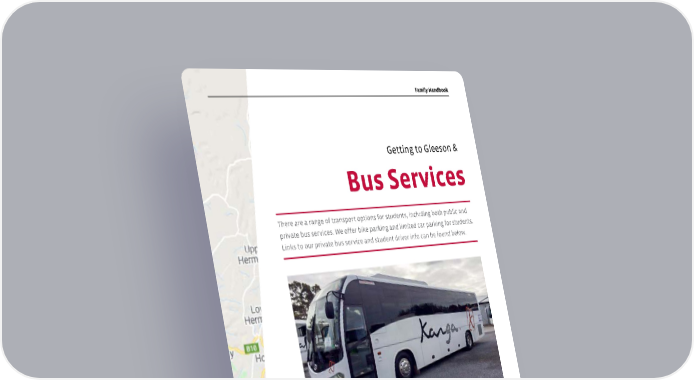 gleeson.sa.edu.au | 29 Family Handbook Bus Services Getting to Gleeson & There are a range of transport options for students, including both public and private bus services. We offer bike parking and limited car parking for students. Links to our private bus service and student driver info can be found below. GETTING TO GLEESON PRIVATE BUS SERVICE / BUSMINDER APP Student Driver Form (incl in below policy) STUDENT DRIVER POLICY Shortcuts