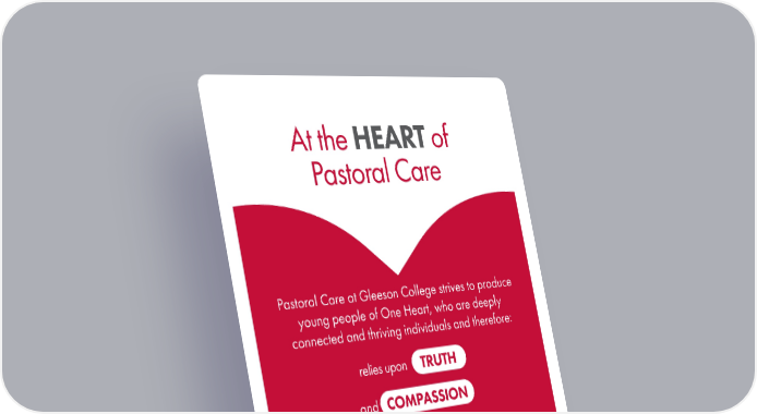 Pastoral Care at Gleeson College strives to produce young people of One Heart, who are deeply connected and thriving individuals and therefore: At the HEART of Pastoral Care relies upon TRUTH and COMPASSION where everyone displays DIGNITY, RESPECT and JUSTICE to nurture a community of PEACE & HARMONY.