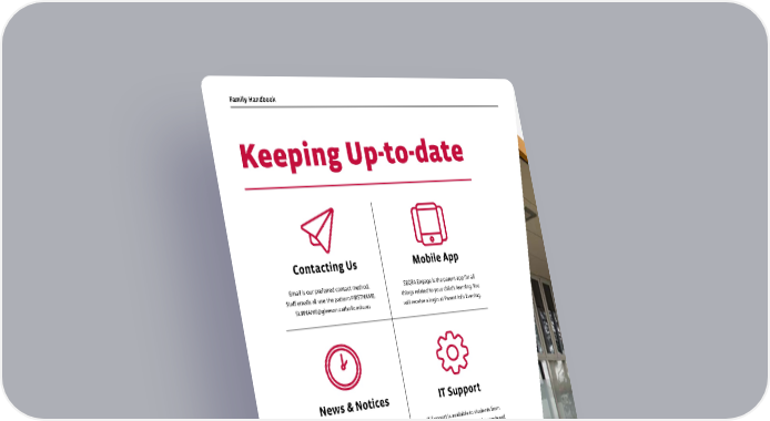 10 | gleeson.sa.edu.au Family Handbook Keeping Up-to-date Contacting Us Mobile App Social Media Email is our preferred contact method. Staff emails all use the pattern FIRSTNAME. [email protected] Direqt Messaging SEQTA does include a ‘direct messaging’ function for families and staff, however, please note there can be delays with direqt messages being received. IT Support IT Support is available to students from 8am to 4pm at the IT office in the courtyard. Students can also email ICT@ gleeson.catholic.edu.au SEQTA Engage is the parent app for all things related to your child’s learning. You will receive a login at Parent Info Evening. News & Notices Our fortnightly newsletter, The Globe, gives a snapshot into College life, and contains important updates and dates. Updates are also shared on our social media pages. Follow us through our social media: Facebook ... facebook.com/GleesonCollege Instagram ... instagram.com/gleeson_college/ Old Scholars ... facebook.com/gleesonoldscholars