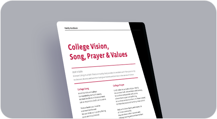 6 | gleeson.sa.edu.au Family Handbook Amid the hills and valleys. Surrounded by so much beauty. We look for Christ in those we meet. Let us respond to God’s call to serve. To be a leader you must be a servant to the rest. We can drink our cup of suffering as we are truly blessed. Chorus For with one heart we seek the truth. With one heart we search for peace. With one heart we strive for justice. United with one heart. We respect each other’s dignity. To live our lives in harmony. We walk in the shadow of the cross. Let us respond to God’s call to love. To be a leader you must be a servant to the rest. We can drink our cup of suffering as we are truly blessed. Chorus Lord, make me a student of your World, let us show truth, where there is dishonesty, let us show compassion and justice, where there is pain and suffering, let us show service to others, for those in need, let there be peace and harmony in our school. Help us to show dignity and respect to all in our community. May we show pride in success and lifelong learning and continue to have pursuit of excellence. Bless Gleeson College as a place where we all belong to a faith‐filled community with you as our teacher. Together We Pray Response: With One Heart Amen College Vision, Song, Prayer & Values OUR VISION Gleeson College is a faith-filled community that provides its members with the opportunity to discover, develop and use their God-given talents and abilities in the service of others. College Song College Prayer