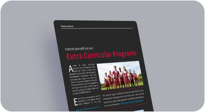 46 | gleeson.sa.edu.au Family Handbook A range of extra curricular programs are offered each year based on student interest and demand. Contact details for our Sports Development Coordinator and Arts Learning Area Leader are below for specific inquiries. Students will be able to enrol in extra curricular programs at the beginning of each school year by accessing various enrolment links and surveys via SEQTA Notices. E xtra Curricular programs will be populated at the below website when finalised for the year: gleeson.sa.edu.au/extra-curricular The ‘Sports’ page on SEQTA contains all match fixtures and information relating to extra-curricular sport. You can also contact our Sports Development Coordinator (see below) for more information. SEQTA Sports Page (requires login) SPORTS Contact Ms Rachel Staffin our Sports Development Officer, with any queries regarding extra-curricular sport, eg knockout, Saturday Morning, trainings and more, on rachel. [email protected]. edu.au PERFORMING ARTS Contact Mrs Carly Meakin our Music and Performance Learning Area Leader, with any queries for our music ensembles, dance troupes, drama, musical and eisteddfod opportunities on carly.meakin@gleeson. catholic.edu.au STRETCH PROGRAM Contact Ms Louisa Straschko our Gifted and Talented Coordinator, with any queries for our stretch (extension) program on louisa.straschko@gleeson. catholic.edu.au STEM CLUB Contact Mr Stephen Tulip, our Science Learning Area Leader, with any queries for our range of STEM programs such as STEM Society, on stephen.tulip@ gleeson.catholic.edu.au Extra Curricular Programs Extend yourself via our...