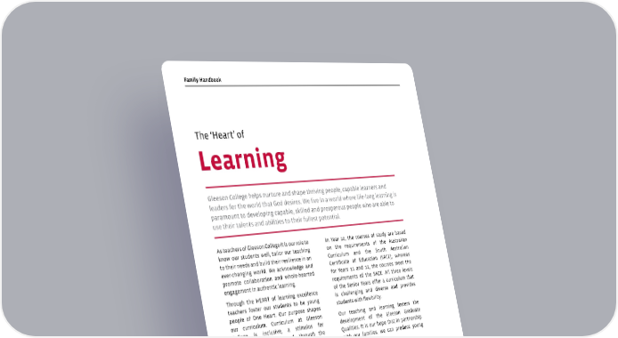 34 | gleeson.sa.edu.au Family Handbook As teachers of Gleeson College it is our role to know our students well, tailor our teaching to their needs and build their resilience in an ever-changing world. We acknowledge and promote collaboration and whole-hearted engagement in authentic learning. Through the HEART of learning excellence teachers foster our students to be young people of One Heart. Our purpose shapes our curriculum. Curriculum at Gleeson College is inclusive, a stimulus for personal achievement and, through the broadening of experience of the world, is an encouragement towards informed and responsible citizenship. It is designed to be engaging and active, involve challenging goals, shared responsibilities and standards. Teachers develop course outlines aligned to ACARA and the CESA Key and SACE General Capabilities. Our assessment is authentic and accessible to all and results in the sharing of timely, descriptive feedback. In Years 7-9, the courses of study are based on the requirements of the Australian Curriculum Assessment and Reporting Authority (ACARA). All three levels of the Middle Years offer a curriculum that is challenging and diverse and provides students with flexibility. In Year 10, the courses of study are based on the requirements of the Australian Curriculum and the South Australian Certificate of Education (SACE); whereas for Years 11 and 12, the courses meet the requirements of the SACE. All three levels of the Senior Years offer a curriculum that is challenging and diverse and provides students with flexibility. Our teaching and learning fosters the development of the Gleeson Graduate Qualities. It is our hope that in partnership with our families, we can produce young people who are: Deeply connected Thriving individuals Competent and capable learners Just, merciful and humble leaders Learning The ‘Heart’ of Gleeson College helps nurture and shape thriving people, capable learners and leaders for the world that God desires. We live in a world where life-long learning is paramount to developing capable, skilled and prosperous people who are able to use their talents and abilities to their fullest potential. CURRICULUM HANDBOOKS SUBJECT CHANGE POLICY ACCELERATION POLICY YEAR LEVEL PROGRESSION POLICY