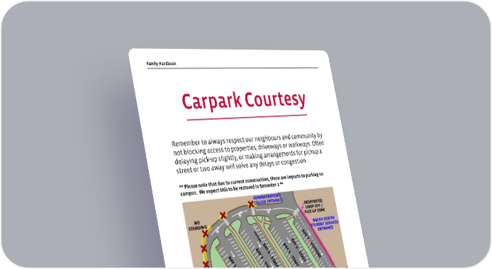 Remember to always respect our neighbours and community by not blocking access to properties, driveways or walkways. Often delaying pick-up slightly, or making arrangements for pickup a street or two away will solve any delays or congestion. ** Please note that due to current construction, there are impacts to parking on campus. We expect this to be restored in Semester 2 ** 18 | gleeson.sa.edu.au Family Handbook Carpark Courtesy