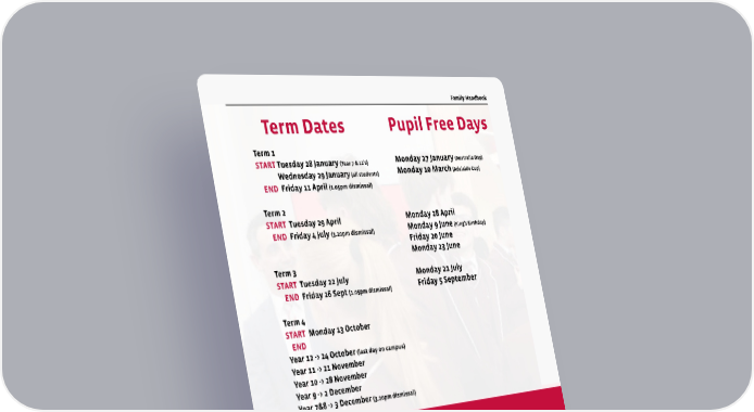 gleeson.sa.edu.au | 15 Family Handbook r Leaving Early? If a student arrives late to the College, between 8.40am and 8.55am, they should report directly to their Care Group with a signed note from their parent/caregiver explaining the lateness. This note must be shown to the Care Group teacher during Care Group time. If a student arrives late to the College, after 8.55am, they should report directly to Student Services with signed note from their parent/caregiver explaining the lateness. LEAVING EARLY Students must have a signed note, email or SMS from their parent/caregiver to their Care Group teacher and / or Student Services. Students must report to Student Services before departing the College to sign out. A student returning to the College on the same day, must then check back in on arrival to Student Services. Term Dates Pupil Free Days Term 1 START Tuesday 28 January (Year 7 & 12’s) Wednesday 29 January (all students) END Friday 11 April (1.05pm dismissal) Term 2 START Tuesday 29 April END Friday 4 July (3.20pm dismissal) Term 3 START Tuesday 22 July END Friday 26 Sept (1.05pm dismissal) Term 4 START Monday 13 October END Year 12 -> 24 October (last day on campus) Year 11 -> 21 November Year 10 -> 28 November Year 9 -> 2 December Year 7&8 -> 3 December (3.20pm dismissal) Monday 27 January (Australia Day) Monday 10 March (Adelaide Cup) Monday 28 April Monday 9 June (King’s Birthday) Friday 20 June Monday 23 June Monday 21 July Friday 5 September Family Handbook