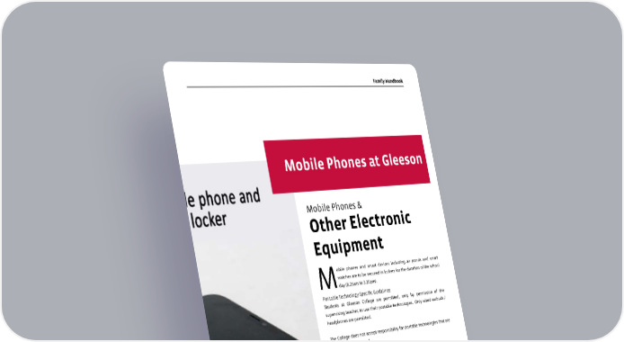 gleeson.sa.edu.au | 41 Family Handbook Other Electronic Equipment Mobile Phones & Mobile Phones at Gleeson BYOD/Acceptable Use Policy Social Media Tips/Information Links to important documents M obile phones and smart devices including air ponds and smart watches are to be secured in lockers for the duration of the school day (8.25am to 3.20pm). Portable Technology Specific Guidelines Students at Gleeson College are permitted, only by permission of the supervising teacher, to use their portable technologies. Only wired earbuds / headphones are permitted. The College does not accept responsibility for portable technologies that are lost, stolen or damaged. In order to protect the privacy of the individuals on our campus, the taking of photographs or video footage, using devices including the mobile phone, requires the permission of the Subject Teacher or House Leader. Students breaching these policies will be asked to surrender their technology to Student Services, with further consequences including permanent bans on bringing this tech to school. Mobile Phones & Other Electronic Equipment