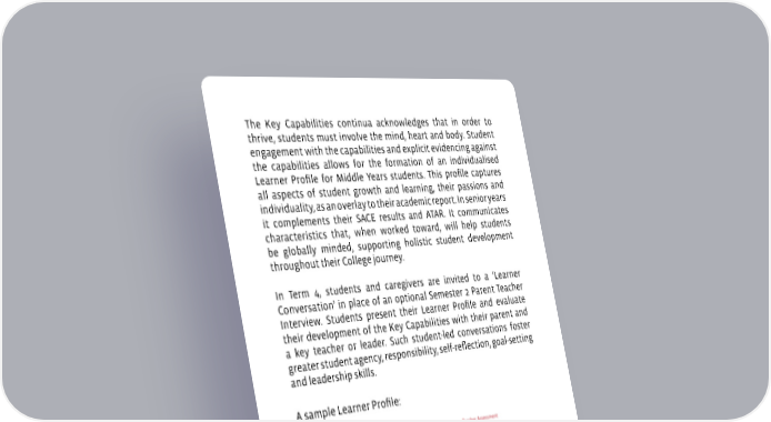 A sample Learner Profile: The Key Capabilities continua acknowledges that in order to thrive, students must involve the mind, heart and body. Student engagement with the capabilities and explicit evidencing against the capabilities allows for the formation of an individualised Learner Profile for Middle Years students. This profile captures all aspects of student growth and learning, their passions and individuality, as an overlay to their academic report. In senior years it complements their SACE results and ATAR. It communicates characteristics that, when worked toward, will help students be globally minded, supporting holistic student development throughout their College journey. In Term 4, students and caregivers are invited to a ‘Learner Conversation’ in place of an optional Semester 2 Parent Teacher Interview. Students present their Learner Profile and evaluate their development of the Key Capabilities with their parent and a key teacher or leader. Such student-led conversations foster greater student agency, responsibility, self-reflection, goal-setting and leadership skills.