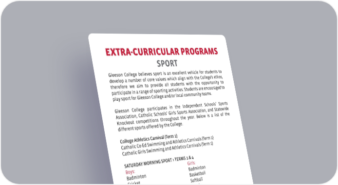 EXTRA-CURRICULAR PROGRAMS SPORT Gleeson College believes sport is an excellent vehicle for students to develop a number of core values which align with the College’s ethos, therefore we aim to provide all students with the opportunity to participate in a range of sporting activities. Students are encouraged to play sport for Gleeson College and/or local community teams. Gleeson College participates in the Independent Schools’ Sports Association, Catholic Schools’ Girls Sports Association, and Statewide Knockout competitions throughout the year. Below is a list of the different sports offered by the College. College Athletics Carnival (Term 1) Catholic Co-Ed Swimming and Athletics Carnivals (Term 1) Catholic Girls Swimming and Athletics Carnivals (Term 1) SATURDAY MORNING SPORT > TERMS 1 & 4 Boys: Girls: Badminton Badminton Cricket Basketball Tennis Softball Volleyball Tennis SATURDAY MORNING SPORT > TERMS 2 & 3 Boys: Girls: AFL Football AFL-W Basketball Netball Hockey Volleyball World Football World Football KNOCKOUT SPORT > TERMS 1-4 AFL Football AFL-W Basketball Netball Cricket Tennis Futsal (5-a-Side Indoor Soccer) World Football