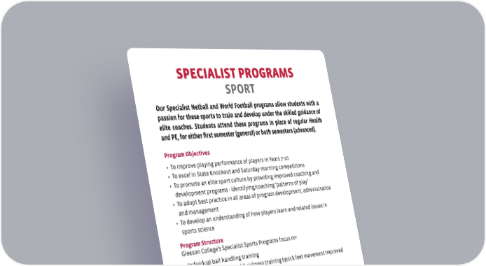 SPECIALIST PROGRAMS SPORT Our Specialist Netball and World Football p rograms allow students with a passion for these sports to train and develop under the skilled guidance of elite coaches. Students attend these programs in place of regular Health and PE, for either first semester (general) or both semesters (advanced). Program Objectives • To improve playing performance of players in Years 7-10 • To excel in State Knockout and Saturday morning competitions • To promote an elite sport culture by providing improved coaching and development programs - identifying/coaching ‘patterns of play’ • To adopt best practice in all areas of program development, administration and management • To develop an understanding of how players learn and related issues in sports science Program Structure Gleeson College’s Specialist Sports Programs focus on: • Individual ball handling training • SAQ - Speed, Agility and Quickness training (quick feet movement improved coordination and fast twitch training) • Playing skills • Team related tactical knowledge - Group plays, tactics and communication • Basic Umpiring Clinic • Fitness - Aerobic, speed and agility testing • Pre-match preparation skills including dietary requirements and post-match recovery techniques Program Pathways Successful completion of the course will provide opportunities to pursue: • Careers in Semi-Professional Netball • Coaching • Umpiring • Study in SACE pathway of Physical Education or Certificate III in Fitness (delivered at Gleeson College) • Work in Sport and Recreation