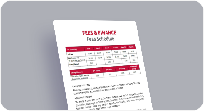 FEES & FINANCE Camp/Retreat Fees Students in Years 7, 9, 11 and 12 participate in a three-day Retreat/Camp. The cost covers transport, accommodation, meals and all activities. Additional Charges The costs of activities such as the World Football and Netball Programs, Outdoor Education, Doorways to Construction, Certificate III in Fitness, Instrument Tuition, Revision Guides (Year 12), subject specific workbooks, and some Design and Technology projects, are invoiced to your account. Vocational Education and Training (VET) Fees Students studying VET courses are responsible for payment of VET fees, once enrolment is approved. The College subsidises a portion of VET fees. Withdrawal or non-completion of the course will result in the full cost of the course payable and charged to families. *Low Income Fee (School Card discount) The scheme is conducted by the Department for Education (DfE) and provides financial assistance towards the cost of educational expenses for full time students. For approved School Card recipients, the College will reduce the annual ‘full fee’ by 50%. All School Card families must complete an application each year with the forms and eligibility criteria in January. The discount is credited once the College receives confirmation of eligibility from DfE. Application and Admission Fee A non-refundable Application Fee of $50 is payable by families upon lodgement of enrolment for each student. A non-refundable Admission Fee of $155 is payable upon acceptance of offer of placement to secure your child/ren’s position. Fees Schedule