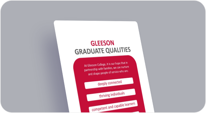 At Gleeson College, it is our hope that in partnership with families, we can nurture and shape people of service who are: GLEESON GRADUATE QUALITIES just, merciful and humble leaders competent and capable learners thriving individuals deeply connected for the world God desires