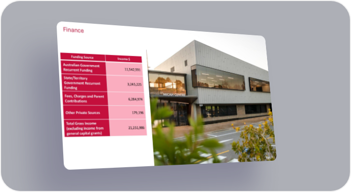 Finance Page 22 Funding Source Income $ Australian Government Recurrent Funding 11,542,591 State/Territory Government Recurrent Funding 3,245,225 Fees, Charges and Parent Contributions 6,284,974 Other Private Sources 179,196 Total Gross Income (excluding income from general capital grants) 21,251,986