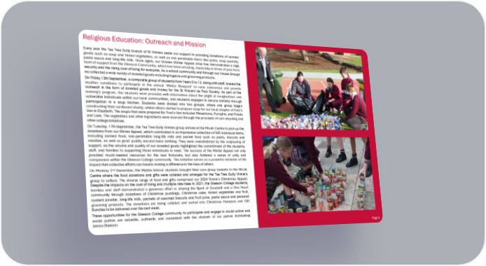 Religious Education: Outreach and Mission Page 6 Every year the Tea Tree Gully branch of St Vinnies seeks our support in providing donations of canned goods such as soup and tinned vegetables, as well as non-perishable items like pasta, soup packets, pasta sauce and long-life milk. Once again, our Vinnies Winter Appeal drive has demonstrated a high level of support from the Gleeson Community, which has been amazing, especially in times of poor food security and the rising cost of living for everyone. As a school community and through our House Groups we collected a wide variety of donated goods including hygiene and grooming products. On Friday 13th September, a composite group of students from Years 9 to 12, along with staff, braved the weather conditions to participate in the annual ‘Winter Sleepout’ to raise awareness and provide outreach in the form of donated goods and money for the St Vincent de Paul Society. As part of the evening’s program, the students were provided with information about the plight of marginalised and vulnerable individuals within our local communities, and students engaged in service ministry through participation in a soup kitchen. Students were divided into two groups, where one group began constructing their cardboard shanty, whilst others started to prepare soup for our local chapter of Fred’s Van in Elizabeth. The soups that were prepared for Fred's Van included Minestrone, Pumpkin, and Potato and Leek. The vegetables and other ingredients were sourced through the proceeds of can recycling and other college initiatives. On Tuesday, 17th September, the Tea Tree Gully Vinnies group arrived at the Micah Centre to pick up the donations from our Winter Appeal, which culminated in an impressive collection of 945 individual items, including canned food, non-perishable long-life milk and packet food such as pasta, biscuits and noodles, as well as good quality second-hand clothing. They were overwhelmed by the outpouring of support, as the volume and quality of our donated goods highlighted the commitment of the students, staff, and families to supporting those individuals in need. The success of the Winter Appeal not only provided much-needed resources for the less fortunate, but also fostered a sense of unity and compassion within the Gleeson College community. This initiative serves as a powerful reminder of the impact that collective efforts can have in making a difference in the lives of others. On Monday 2nd December, the Middle School students brought their care group baskets to the Micah Centre where the food donations and gifts were collated and arranged for the Tea Tree Gully Vinnie's group to collect. The diverse range of food and gifts comprised our 2024 Vinnie's Christmas Appeal. Despite the impacts on the cost of living and multiple rate rises in 2024, the Gleeson College students, families and staff demonstrated a generous effort in sharing the Spirit of Goodwill and a One Heart community through donations of Christmas puddings, Christmas cake, tinned vegetables and fruit, custard powder, long-life milk, packets of assorted biscuits and fruit juice, pasta sauce and personal grooming products. The donations are being collated and sorted into Christmas Hampers and Gift Bundles to be delivered over the next week. These opportunities for the Gleeson College community to participate and engage in social action and social justice are valuable, authentic and consistent with the charism of our patron Archbishop James Gleeson.