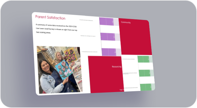 Gleeson College School Performance Report – 2024 Page 24 Page 26Parent Satisfaction A summary of some data received via the 2024 CESA Live Learn Lead Survey is shown at right from our top two scoring areas. Page 22 Community Resourcing Page 23