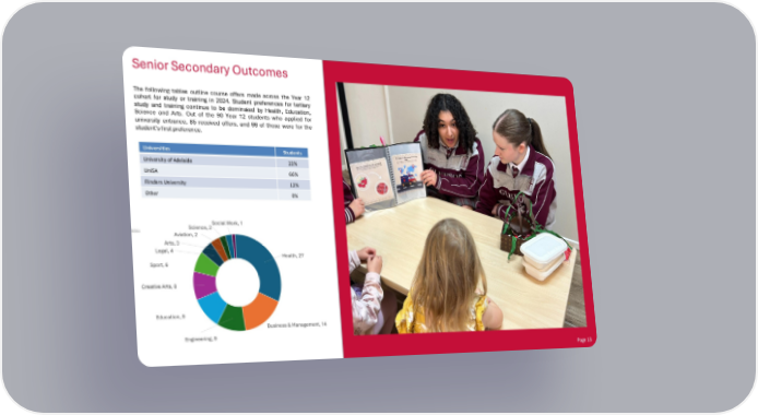Senior Secondary Outcomes The following tables outline course offers made across the Year 12 cohort for study or training in 2024. Student preferences for tertiary study and training continue to be dominated by Health, Education, Science and Arts. Out of the 90 Year 12 students who applied for university entrance, 85 received offers, and 66 of those were for the student's first preference. Page 13 Universities Students University of Adelaide 22% UniSA 66% Flinders University 12% Other 0%