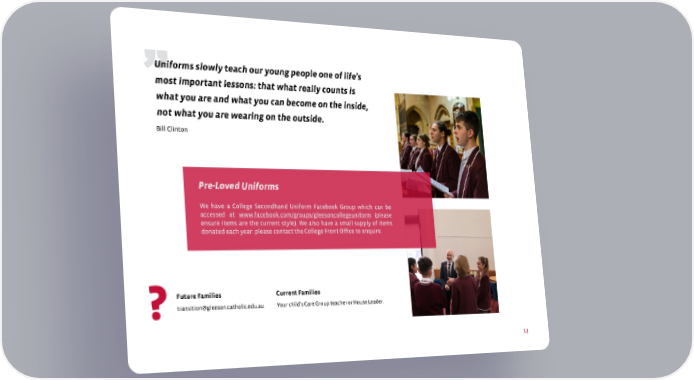 We have a College Secondhand Uniform Facebook Group which can be accessed at www.facebook.com/groups/gleesoncollegeuniform (please ensure items are the current style). We also have a small supply of items donated each year: please contact the College Front Office to enquire. Pre-Loved Uniforms 13 ” ? Uniforms slowly teach our young people one of life’s most important lessons: that what really counts is what you are and what you can become on the inside, not what you are wearing on the outside. Bill Clinton transition@gleeson.catholic.edu.au Future Families Your child’s Care Group teacher or House Leader. Current Families