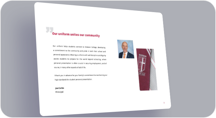 3 ” Joe Corbo Principal Our uniform helps students connect to Gleeson College, developing a commitment to the community and pride in both their school and personal appearance. Wearing a uniform with self-discipline and dignity assists students to prepare for the world beyond schooling, where personal presentation is often crucial in securing employment, and of course, in many other aspects of adult life. I thank you in advance for your family’s commitment to maintaining our high standards for student personal presentation. Our uniform unites our community
