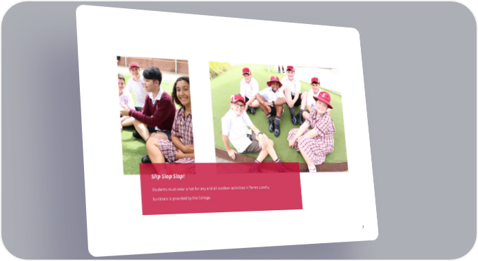 7 Students must wear a hat for any and all outdoor activities in Terms 1 and 4. Sunblock is provided by the College. Slip Slop Slap!