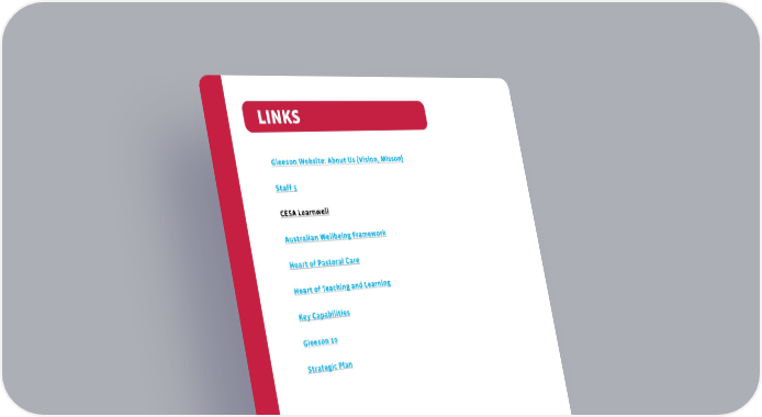 LINKS Gleeson Website: About Us (Vision, Misson) Staff 5 CESA Learnwell Australian Wellbeing Framework Heart of Pastoral Care Heart of Teaching and Learning Key Capabilities Gleeson 10 Strategic Plan HAPPY STAFF WORK WELL