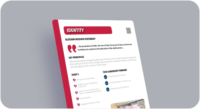 Identity at Gleeson College encompasses all members of the community who respect the Spirituality and Faith of the College. Developing their personal identity, contributing, and belonging to the culture of the College. ...the promotion of faith, the love of God, the person of Jesus and service to others are central to the education of the whole person... • Staff Retreat • Morning prayer • Liturgies & Masses • Gleeson Day • Volunteering • Relay for Life • Winter Sleepout • Soup Kitchen (Vinnies) • Eucharistic and Special Ministry of the Word • Faith Formation • Paish Family Masses • Professional Learning • Graduate Certificate • Service Initiatives Bring a Positive Attitude #1 Leading Catholic Identity Find a Sense of Joy and Love in our work #2 Leading Teaching and Learning #3 Developing Self and Others Contribute to a Collaborative Spirit: relational and respectful Use Creativity Exemplify Professionalism COLLEGE INITIATIVES GLEESON MISSION STATEMENT KEY PRINCIPLES STAFF 5 CESA LEADERSHIP STANDARD HAPPY STAFF WORK WELL IDENTITY