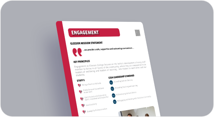 • Sellers Staff House Cup • Wellbeing days • Buddy/ Mentor Program • ECT and new staff program • GC Induction App • Thankful Thursday • Learning Team Meetings • Changeover Semester Day • Streamlined Staff meetings (PCT) • Celebrating birthdays • Semester gifts Engagement at Gleeson College focuses on the holistic development of every staff member to thrive in all facets of the community, where they are empowered to be leaders of wellbeing and leaders of learning , role models to each other and our students. ...we provide a safe, supportive and welcoming environment.... #1 Leading Catholic Identity #2 Leading Teaching and Learning #3 Developing Self and Others #6 Engaging and Working with the School Community COLLEGE INITIATIVES GLEESON MISSION STATEMENT KEY PRINCIPLES STAFF 5 CESA LEADERSHIP STANDARD ENGAGEMENT HAPPY STAFF WORK WELL Bring a Positive Attitude Find a Sense of Joy and Love in our work Contribute to a Collaborative Spirit: relational and respectful Use Creativity Exemplify Professionalism