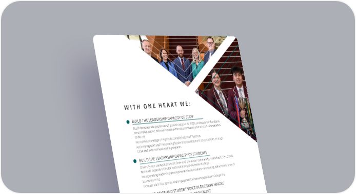 W I T H O N E H E A R T W E : BUILD THE LEADERSHIP CAPACITY OF STAFF Staff demonstrate professional growth relative to AITSL professional standards, creating a positive, safe workplace with cultures that enable all staff communities to thrive. Increase percentage of Highly Accomplished/Lead Teachers. Actively support staff in pursuing leadership development opportunities through CESA and external leadership programs. BUILD THE LEADERSHIP CAPACITY OF STUDENTS Diversify our connections with One+ and the wider community, including CESA schools, to create opportunities for leadership beyond Gleeson College. Incorporating leadership development into curriculum – mentoring, old scholars, project- based learning. Increase visibility, agency and engagement wherever possible in College life. EMBED STAFF AND STUDENT VOICE IN DECISION MAKING AND THE CYCLE OF CONSTANT IMPROVEMENT Promote a culture of trust and openness via transparent communication. Engaging in collaborative planning with staff and students - explore contemporary feedback mechanisms, structured forums, focus groups.