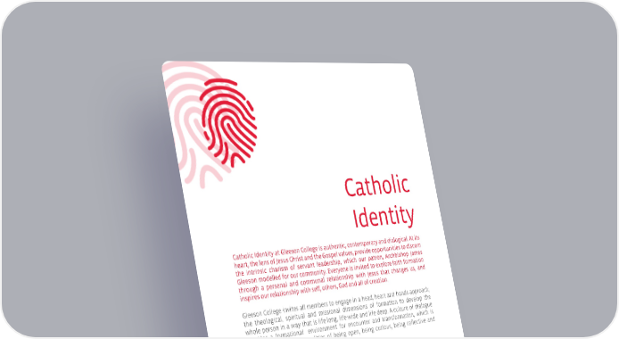 Gleeson College invites all members to engage in a head, heart and hands approach; the theological, spiritual and missional dimensions of formation to develop the whole person in a way that is life-long, life-wide and life-deep. A culture of dialogue provides a formational environment for encounter and transformation, which is enhanced through the qualities of being open, being curious, being reflective and being dialogical. Catholic Identity Catholic Identity at Gleeson College is authentic, contemporary and dialogical. At its heart, the lens of Jesus Christ and the Gospel values, provide opportunities to discern the intrinsic charism of servant leadership, which our patron, Archbishop James Gleeson modelled for our community. Everyone is invited to explore faith formation through a personal and communal relationship with Jesus that changes us, and inspires our relationship with self, others, God and all of creation.