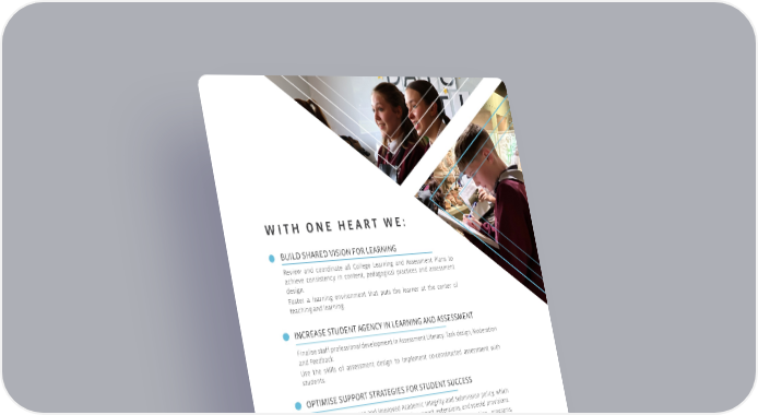 W I T H O N E H E A R T W E : BUILD SHARED VISION FOR LEARNING Review and coordinate all College Learning and Assessment Plans to achieve consistency in content, pedagogical practices and assessment design. Foster a learning environment that puts the learner at the center of teaching and learning. INCREASE STUDENT AGENCY IN LEARNING AND ASSESSMENT Finalise staff professional development in Assessment Literacy: Task design, Moderation and Feedback. Use the skills of assessment design to implement co-constructed assessment with students. OPTIMISE SUPPORT STRATEGIES FOR STUDENT SUCCESS Review and implement and improved Academic Integrity and Submission policy, which includes student support through academic support, extensions, and special provisions. Enhance College evidence-based support strategies and intervention programs, including Literacy and Numeracy initiatives, to ensure all students experience success and development through their learning. INCREASE STUDENT CAPACITY TO MANAGE LEARNING Promote a refined a purposeful curriculum and classroom culture that increases student independence and responsibility towards their learning. PROMOTE CAPABILITY-BASED LEARNING Grow student and staff engagement by engaging all Year 10 and Stage 1 students in the SACE Learner Profile. Review and innovate student engagement with the CESA Key Capabilities in Years 7-9 and the subsequent Learner Profile. Embed the elements of the emerging capabilities into Teaching and Learning plans across the school.