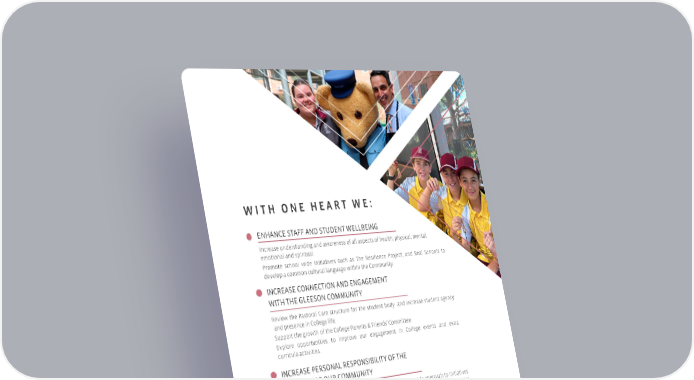 W I T H O N E H E A R T W E : ENHANCE STAFF AND STUDENT WELLBEING Increase understanding and awareness of all aspects of health; physical, mental, emotional and spiritual. Promote school wide initiatives such as The Resilience Project, and Real Schools to develop a common cultural language within the Community. INCREASE CONNECTION AND ENGAGEMENT WITH THE GLEESON COMMUNITY Review the Pastoral Care structure for the student body and increase student agency and presence in College life. Support the growth of the College Parents & Friends’ Committee. Explore opportunities to improve our engagement in College events and extra curricula activities. INCREASE PERSONAL RESPONSIBILITY OF THE MEMBERS OF OUR COMMUNITY Review College policies and the implementation of a school-wide approach to initiatives (e.g., Restorative Practices, Student Responsibility etc.) to promote respectful relationships based on the Gleeson 10. Students and staff continue to build strong relationships, fostering a sense of community, and addressing conflicts and issues in a constructive manner. PROVIDE ACADEMIC AND PASTORAL SUPPORT FOR ALL STUDENTS Whereby every student can experience success through case management structures, mentoring and professional development of staff. Enhance Social and Emotional Learning for students to further promote skills such as empathy, active listening, and effective communication.
