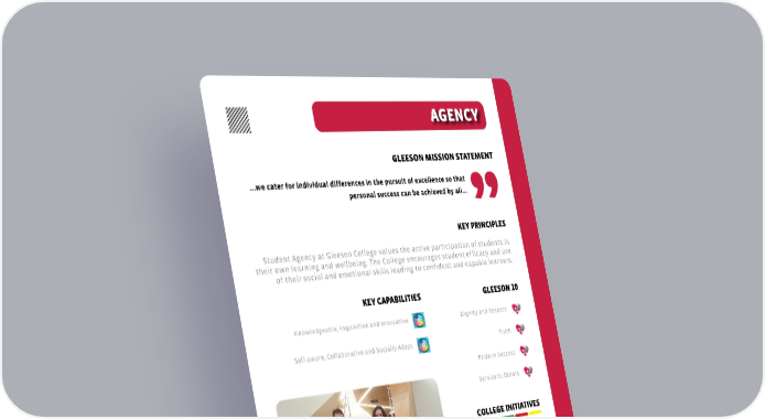 • HOUSE STRUCTUR • • • • • • • Dignity and Respect Knowledgeable, Inquisitive and Innovative Truth Self-aware, Collaborative and Socially Adept Pride in Success Service to Others COLLEGE INITIATIVES GLEESON MISSION STATEMENT KEY PRINCIPLES GLEESON 10 KEY CAPABILITIES AGENCY Student Agency at Gleeson College values the active participation of students in their own learning and wellbeing. The College encourages student efficacy and use of their social and emotional skills leading to confident and capable learners. ...we cater for individual differences in the pursuit of excellence so that personal success can be achieved by all... Learner Profiles & Learner Conversations Y-Lead and City of Tea Tree Gully Leadership workshops Student Leadership Camp Student Leadership structure Clarity program HEART Survey Pulse Survey Resilient Youth Australia survey V1 2023