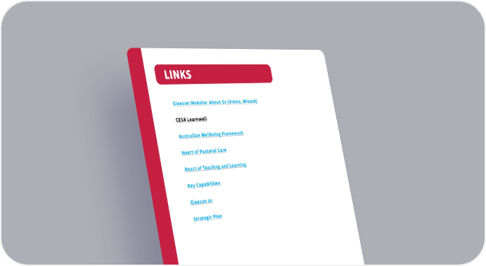 LINKS Gleeson Website: About Us (Vision, Misson) CESA Learnwell Australian Wellbeing Framework Heart of Pastoral Care Heart of Teaching and Learning Key Capabilities Gleeson 10 Strategic Plan HAPPY STUDENTS LEARN WELL